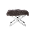 The seat is covered with grey sheepskin to complement the reflective silver finish of the crossed legs. It lends a touch of luxe style to the living room.