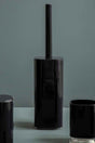 This cylindrical toilet brush holder is made from acrylic that lends it added strength. Featuring a deep black outer, it has a matching handle with a brush attached at its end that is covered with a snug lid.