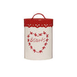 This biscuit canister has a round design in a soft cream finish that enhances the red biscuits lettering surrounded by a red heart detail. A red lid, with a handle and flared trim, neatly fits at the top ensuring to keep contents fresh and airtight.