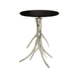 The round top is made from sleek and smooth black marble for a luxurious finish. The base is made from metal and has a reflective nickel finish that accentuates its realistically textured surface.