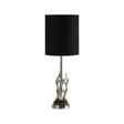 The antler table lamp's pedestal-style base features three distinct steps, one of which is crafted from luxurious dark marble. Three metallic anter designs boast texured engravings and a reflective silver finish.