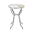 The round side table top features a geometric design with segments of gold mirror, pink mirror and reflective mirror separated by strips of stainless steel. The distinctive silver-finish frame is created from stainless steel.