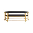 The black mirrored two-tiered shelving have a high gloss finish which is complemented by streamlined, gold finish legs, combining to form an encompassing hexagonal base.