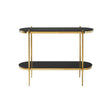 Crafted from stainless steel, this console table has a minimal frame in a luxe gold finish. Two tiers of black tempered glass are set within the sleek frame and enhance its structural elegance.
