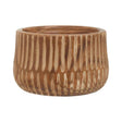 This large wooden planter has a rounded form with brown and natural shades. The simple design with a rural pattern evokes a feeling of homeliness. Paired with foliage, it makes the perfect biophilic piece for any space.