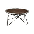 The tabletop is made from sustainable acacia wood, with a rich, dark brown hue that complements the iron. It coordinates well with exotic traveller / fusion furniture and accessories. A slim iron hoop sits atop the legs to support the wood.