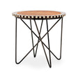 This side table has a round top surface made from acacia wood. Its dark hues and distinctive grain complement the black legs, with white trim that gives it a contemporary geometric look. The iron legs form a distinctive lattice and feature a weathered finish that lends further texture to this luxury piece.
