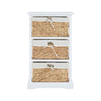 This modern chest features a tall, natural wood stand in chic white finish. Made from natural water hyacinth, three pull out baskets contrast the simple painted frame. Each woven basket in rustic texture is completed with a removable liner inside.