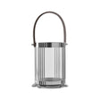 This lantern is a sleek combination of reflective silver finish steel and clear glass. Slim steel piping at the sides breaks up the otherwise minimal aesthetic. A black leather handle provides a material contrast.