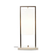 This table lamp has a white fabric cylindrical shade suspended from a slim metal frame in a satin nickel finish. The slender form of the frame complements the slim shade, creating an understated, minimalist look.