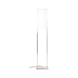 This floor lamp has a white fabric cylindrical shade suspended from a slim metal frame in a satin nickel finish. The slender form of the frame complements the slim shade, creating an understated, minimalist look.