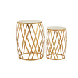The warm gold finish metal wires intersect each other to form a lattice design pattern of these nesting tables. Each contemporary table has a cylindrical structure and the openwaork design creates an airy finish. Rounded mirrored pieces sit atop the frames to amplify the reflective appeal of each table.