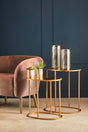 ""Their oval frames are formed from sleek metal and have a gold colour that complements interiors with warm metallic themes. Four straight lines counterpoint the curving design. Mirrored glass is set into their tops. Part of the Avantis collection, they introduce contemporary luxe style to the living room."