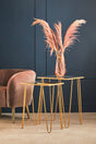 Their hairpin legs give each table a poised look, and the mirrored tops add to their reflective appeal. The legs are made from strong metal and feature a gold finish that complements interiors inspired by warm metallic tones. They make a sophisticated statement in a contemporary luxe-style living room."