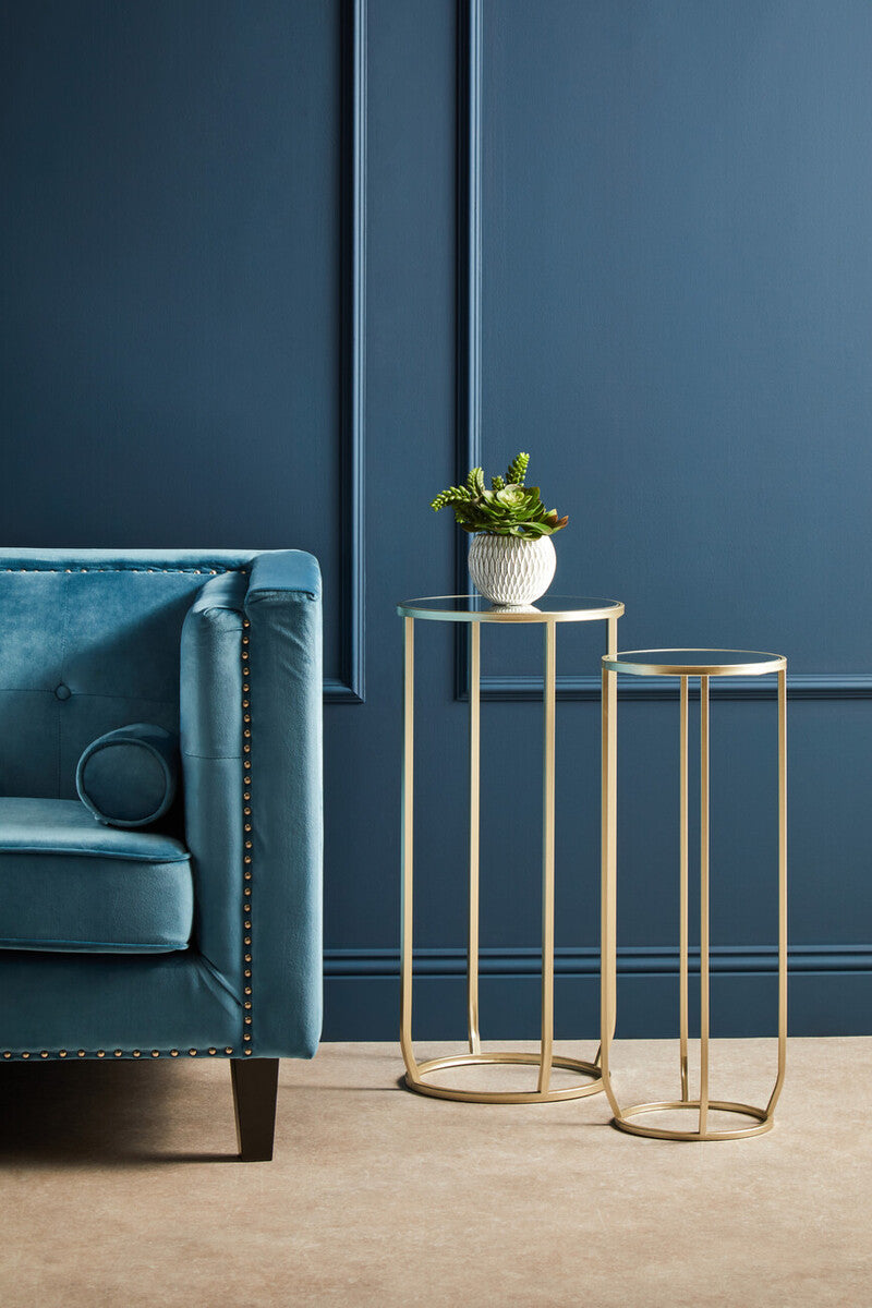 Their round frames are formed from sleek metal and have a champagne colour that complements interiors with warm metallic themes. Four straight lines counterpoint the curving design. Mirrored glass is set into their tops.