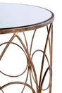 The round mirrored tabletops are inset into a strong metal frame. The frames have an antique copper finish, distressed to provide added character. Their wire-like construction allows for the delicate oval and circular pattern to emerge.
