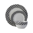 The Avie twelve piece dinner set lends a monochrome accent to the dinner set. Each piece is made from porcelain, and features a glazed finish. The windmill design of the set complements a variety of dining areas.