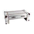 Its weathered finish gives it an upcycled vibe, with symmetrical lines of rivets, metal clasps, and decorative metal side handles enhancing the industrial look. Pinched faux leather corner guards coordinate with the brown strap handles on each drawer.