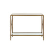 This console table has a rectangular metal frame in a tarnished brass finish adding to the antique effect. Supporting two-tier glass shelves, the frame features a cross design at each end which is connected with a floral motif.