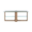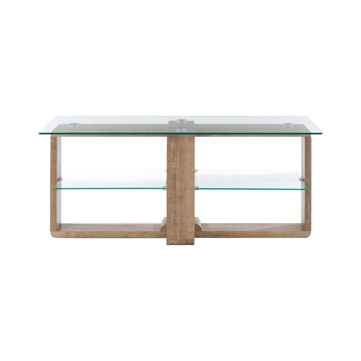 This media unit is topped with clear tempered glass that keeps the clean-lined base visible. A square glass shelf neatly sit inside each side of veneer finish base in white faux graining effect.