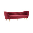 This large three seat sofa is dressed with soft wine velvet. Its channel tufting gives it a textured look, and the flared shoulders add a touch of drama to its silhouette. The brushed gold legs create a luxe finish.