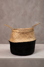 This woven basket is created from sustainable seagrass and retains the neutral colour of this organic material. The seagrass loop handles at either side of the basket's opening have a matching natural finish. The basket's base is covered by reflective black sequins, contrasting with the light colouring of the upper and adding a decorative flourish.