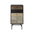 This tall cabinet has five storage drawers, each featuring a distinctive pattern and texture. Made from eco-friendly mango wood, the clean lined frame is coloured in black to match with streamlined base. Practical and decorative, this cabinet will complement a contemporary boho setting with its artistic visual appeal.