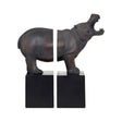 This set of bookends features a large hippo design in a bronze finish that elevates the detail and texture. The sculpture stands above large black square blocks which complement the metallic tones.