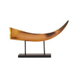 This luxury accent piece is made from textured resin, and has a natural colour with darker patches that give it an authentic look. The horn's base has a gold coloured trim that provides a warm metallic contrast. It is mounted on a black iron stem which is set into a black base made from natural wood.