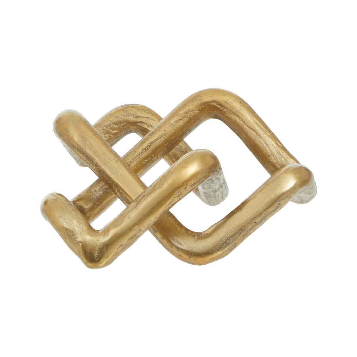 This sculpture is a decorative piece of art is made up of two rough gold finished aluminium links featuring distressed texture. With a modern and minimalist intertwined design, this sculpture will bring sophistication to a shelf or a home of table.