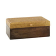 The metal plate on its lid has a warm gold colour that complements the richly toned wood. The circles etched into the lid add an extra layer of texture. Each unit is crafted by hand, lending it its own unique variations.