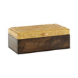 The metal plate on its lid has a warm gold colour that complements the richly toned wood. The circles etched into the lid add an extra layer of texture. Each unit is crafted by hand, lending it its own unique variations.