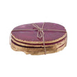 Stunning set of four delicately crafted round slabs of pink agate give accent to the coasters. Asymmetric shape with its opulent warm metallic edging will make a unique statement on tabletop. Each coaster has its own pink translucent and crystalline appeal.