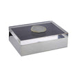 The case is made from smooth steel and has a reflective silver finish that complements textiles and lighting with a metallic colour. Its lid is formed from a thick piece of clear acrylic that extends very slightly over the rim of the case.
