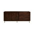 This sideboard offers ample warmth with acacia veneer finish frame featuring a herringbone pattern in light and dark brown tones. Offering ample storage, the drawers and shelves are complemented with antique brass finish handles that coordinate with sleek legs enhancing luxe sophistication.