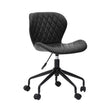 The contemporary home office chair has a scooped seat and a crisscross stitching on black faux leather. Its armless design helps save space. The black base provides support and has wheels for a 360-degree swivel.