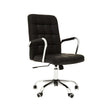 The home office chair has a deep tufted design and is upholstered in black leather effect fabric. It has arm rests with padding for a better posture and a high back for comfort. It has a chrome base and wheels to run fluidly in all directions.
