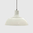 The bowl shaped shade of the Brook pendant light is made from strong metal, with a ridged upper section and subtly extended rim that help to emphasise its curved design. Vent detail on the cylindrical pendant holder contributes to its retro look. A slim round canopy sits flush against the ceiling, its crisp white finish coordinating with the shade.