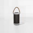 The lamp's cylindrical design is created by way of a series of vertical wooden slats, held in place with reflective silver metal bands at the base and top. Their sleek black finish complements the natural rope detail.