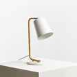 The lamp's stem is formed from a single piece of u-shaped wood. Its light gold colour complements the white metal, with natural grain that lends it texture. The conical lamp head is attached to the wood via a reflective chrome metal hinge, its fully adjustable mechanism making it ideal for using as a task lamp.