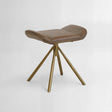 This footstool has a genuine grey leather padded seat with channel detailing and elevated slanted sides. The seat is complemented and supported by a luxe gold finish iron spoke base.