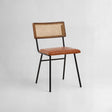 This dining chair creates a stylish look with a mix of modern elements. The padded seat is upholstered in genuine tan leather, featuring channel tufting, which contrasts elegantly with the black iron legs.
