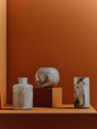Skilfully crafted from glass, this round marble effect glass vase is a standalone decorative piece in a sleek polished finish. The grey and white hues on the smooth surface boast a marble like veining that enhances the elemental appeal of the vase.