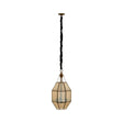 Small chains attach to the light's three bulb inner framework. The shade's metal frame has a panelled design, and has a brass colour that perfectly complements the antique brown finished glass panes.