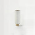 The small Callie white and gold pedestal vase is crafted from strong and sturdy stoneware and boasts a cylindrical shape supported by a contrasting metallic base. The top section of this robust stoneware vase has a smooth surface with a shiny base offering a mid-century modern platform for displaying floral arrangements.