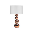 Simply touch this lamp's spherical base to activate it and adjust between three brightness settings. Formed from copper effect metal, the spheres reduce in size as they near the bulb, giving the lamp a delicate, tapered look. The drum-shaped shade is made from soft white fabric. Display with metallic accessories and lighting."