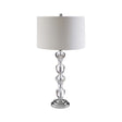 This table lamp features a crystal glass stand with a stepped design which enhances its decorative appeal. It is complemented by a chrome finish tiered pedestal which adds a metallic touch to counterpoint transparent hues. A white fabric shade will disperse light gently downwards while creating a radiant ambience.