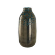 Created from thick glass, the small Caris vase adopts a traditional silhouette with a top that tapers inward. The glass, which is tinted a dark shade of turquoise, is partly concealed by a striking metallic finish. The textural finish combines dark gunmetal tones with warmer hues. The turquoise glass is revealed at the vase's top through a unique speckled design.