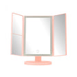 The pink tri-fold pannel mirror has one main panel and two foldable sides. The main mirror has a LED light stripe along the border which is activated by a touch sensor. The round base keeps the mirror stable and allows smooth rotation.