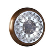 Its glass face is coloured white and features decorative motifs that, along with the exposed gears, give the clock a steam punk edge. A pair of black spade hands complements the Roman numeral detail. The thick frame is coloured antique gold.